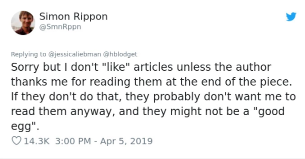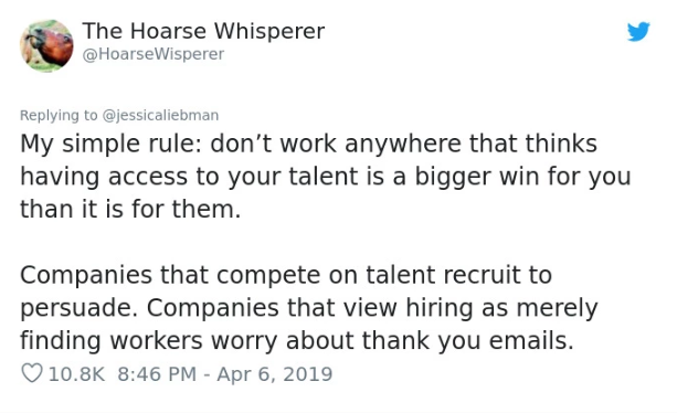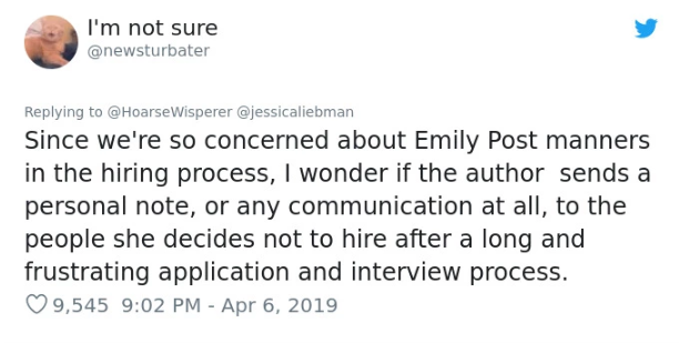 Jessica Liebman took to Twitter and shared her article: “Hey, I wrote something! … I’ve been hiring people for 10 years, and I still swear by a simple rule: If someone doesn’t send a thank you email, don’t hire them.” She also added a link to her article posted on Business Insider.