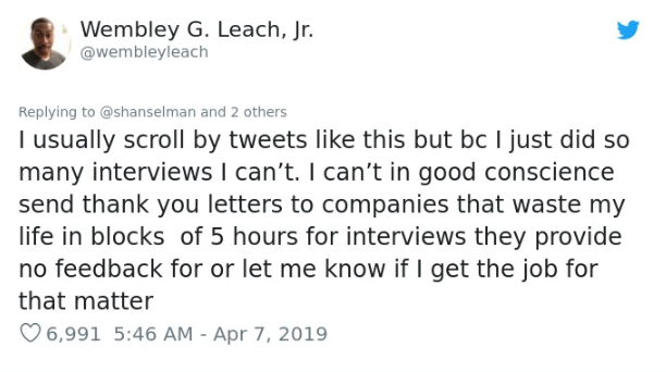 Twitter user kristy wrote: “If people can follow the other “rules” of interviewing – e.g., bringing a resume with them, dressing nicely, being on time, etc. – I don’t know why sending a thank-you note/email is so crazy. We far prefer them. Esp for client-service roles.”
