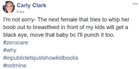 “The next female that tries to whip her boob out to breastfeed in front of my kids will get a black eye, move that baby because I’ll punch it too,” Carly Clark wrote in her Facebook post.