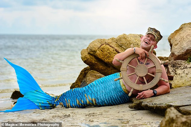 Beau Shepherd put up his military hat as well as a blue and gold merman tail for the shoot, which he said was meant to cheer up troops deployed overseas.