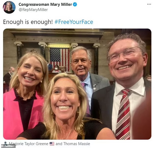 Conservative Representative Marjorie Taylor Greene and three other lawmakers have posted the picture on Twitter to rebel against Pelosi’s mask mandate, smiling without masks on.