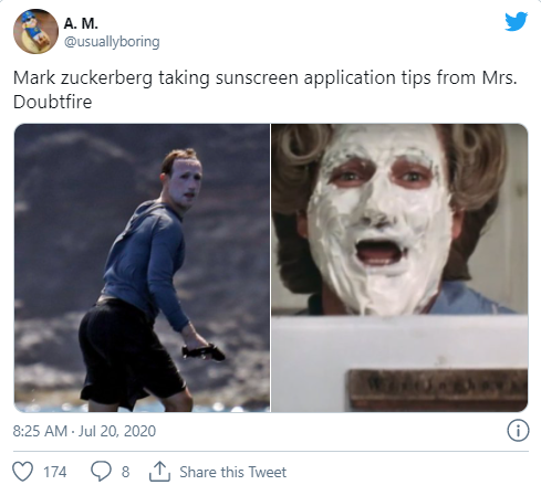 “I noticed there was this paparazzi guy following us and, so I was like, ‘Oh I don’t want him to recognize me so you know what I’m gonna do? I’m just gonna put a ton of sunscreen on my face,” Zuckerberg explained.