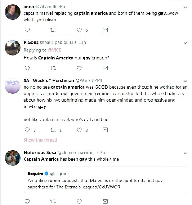 Fans posted: ‘’captain marvel replacing captain America and both of them being gay…wow what symbolism’; ‘Also I would like to thank the filmmakers for keeping Carol’s massive gay energy alive in that movie #CaptainMarvel.’’