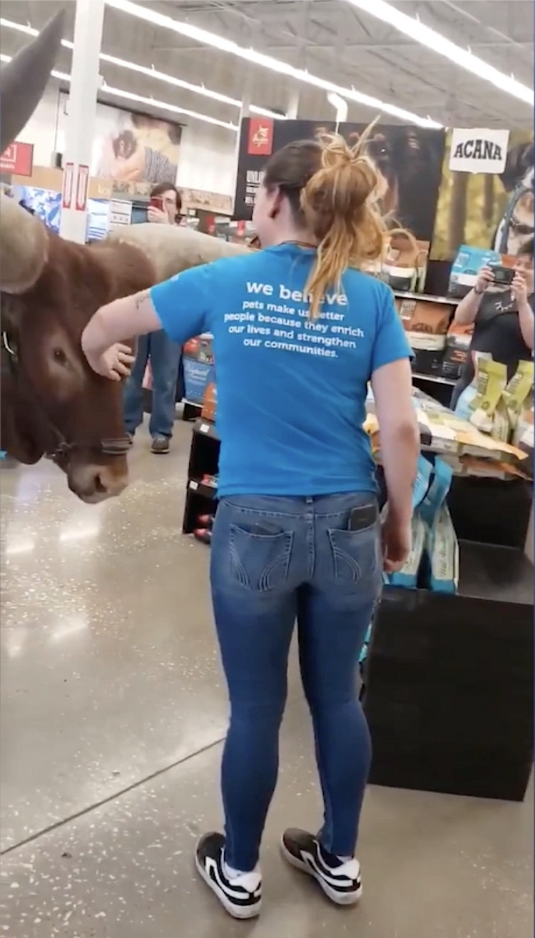 Video footage shows Vince leading Oliver in through two sets of automatic doors with the friendly 14-year-old animal appreciating a few head pats from the store’s staff.