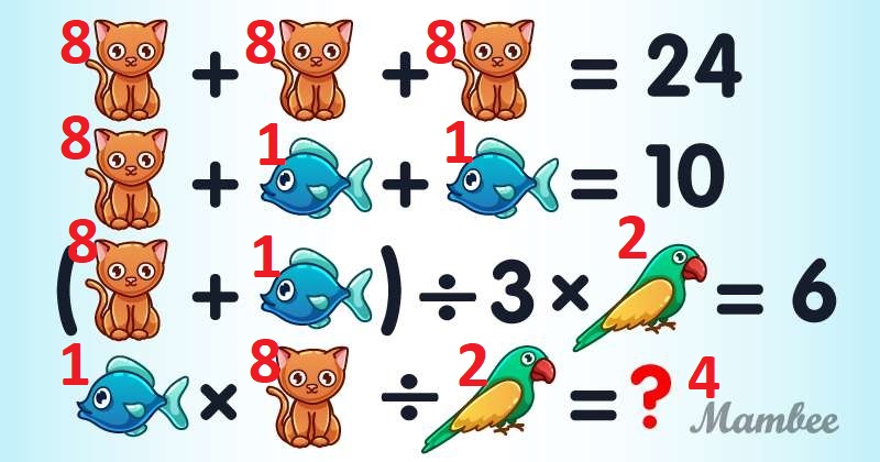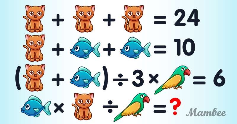 Keep in mind that all of the three icons, including a parrot, fish, and cat, have different values, and there is only one correct result.