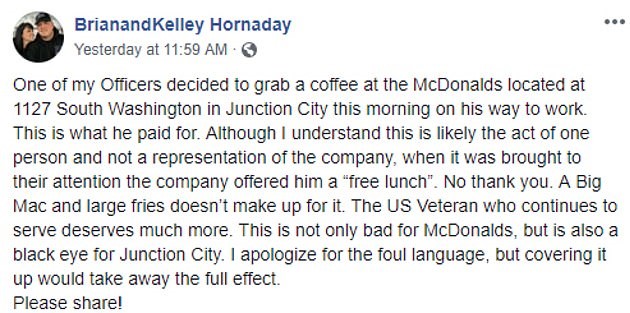 “No thank you. A Big Mac and large fries doesn’t make up for it. The US Veteran who continues to serve deserves much more. This is not only bad for McDonald’s, but is also a black eye for Junction City. I apologize for the foul language, but covering it up would take away the full effect.”