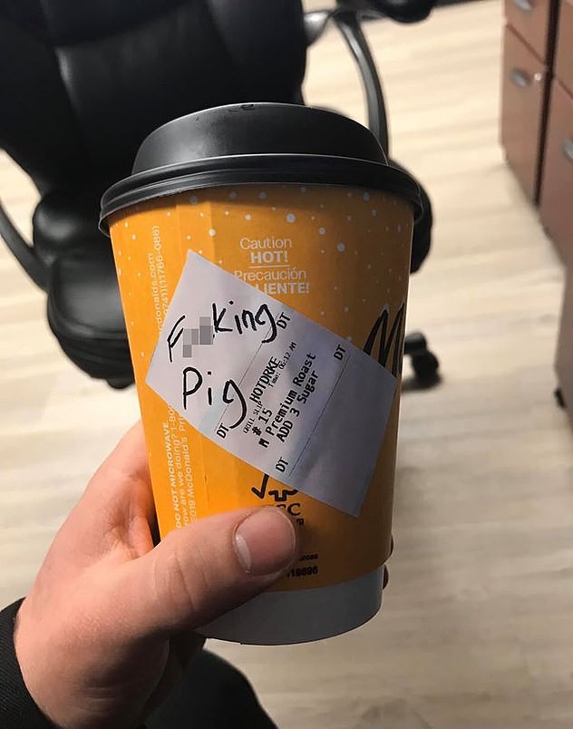 The incident came to light after the officer in question saw the disgusting handwritten comment on top of the sticker on the premium roast beverage he ordered.