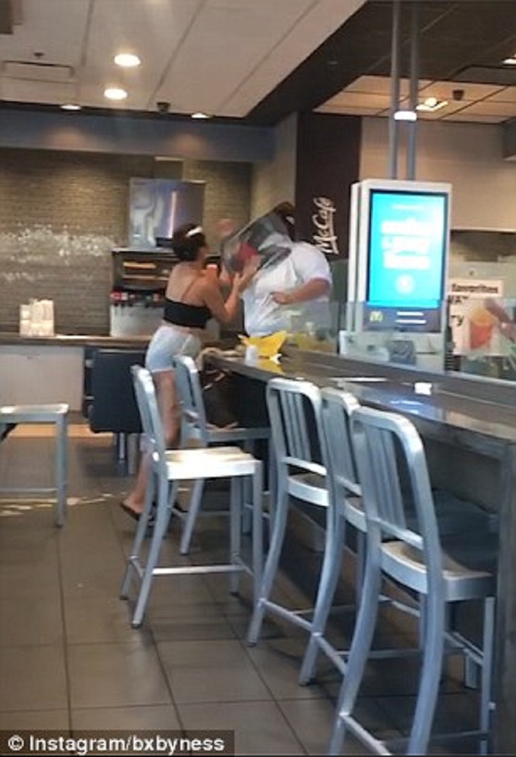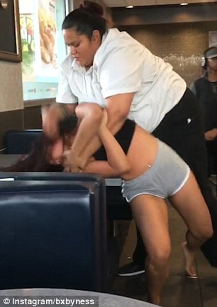 Shocking video footage captures the moment a female McDonald’s employee starts giving a beatdown on a female customer she had been arguing with.