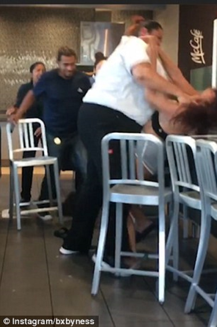 When the customer threw a milkshake and hit another employee, the giant of a McDonald’s employee decided to lay into the much smaller customer and the brawl was on.