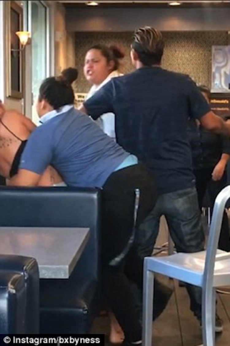 The customer kept hitting the employee with a food tray but that didn’t deter the enraged employee and she grabbed the customer by the hair and pulled her around while slapping her. She even slammed the customer to a nearby table. The tussle even partially dislodged the customer’s top, leaving one of her boobs dangling out before she was slammed again.