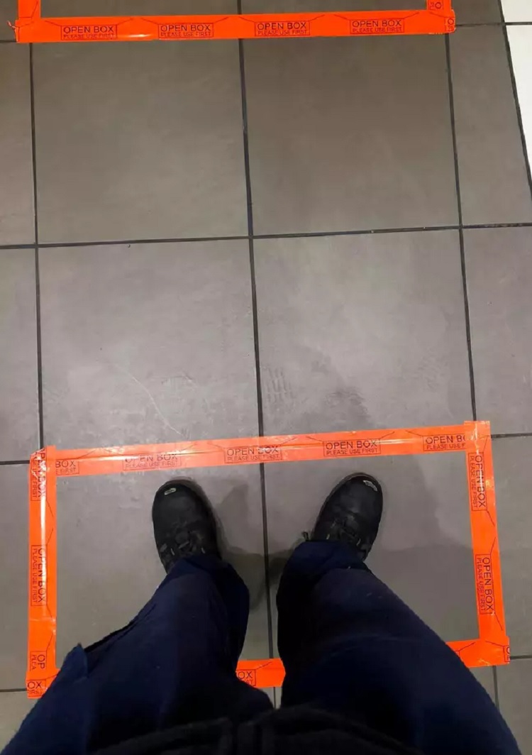 A series of boxes marked with red tape and spaced two floor tiles apart dotted the area in front of the counter.