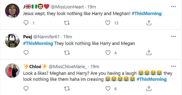 One Twitter user wrote: “Lookalilkes? Meghan and Harry? Are you having a laugh? They look nothing like them. I’m creasing.”