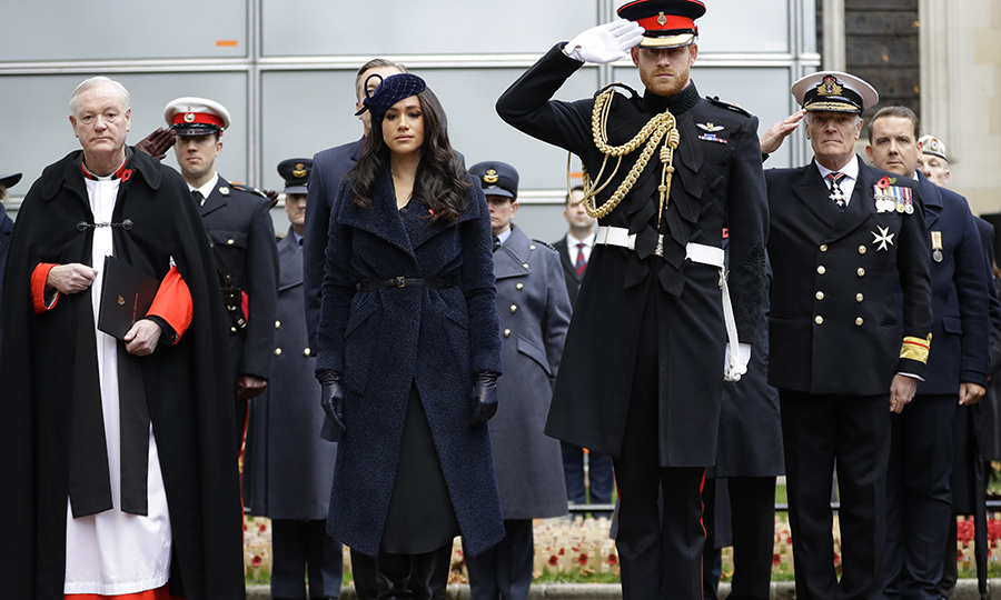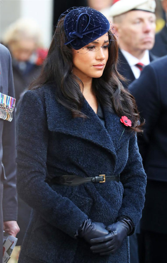 Meghan, 38, donned a blue wrap coat from Sentaler’s Fall/Winter 2015 collection which she paired with a matching fascinator from her go-to milliner, Philip Treacy. The Remembrance Poppy — an artificial flower was tucked to her coat.