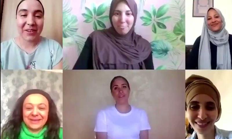 The Duchess donned a simple white T-shirt and wore her hair back during the call. She chatted with Hubb Community Kitchen manager Leila Hedjem, Cherine Mallah, Halima Al-Hudafi, Oxana Sinitsyna and Jennifer Odonkor about their latest project.