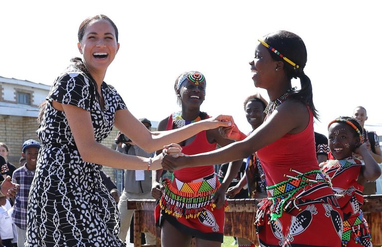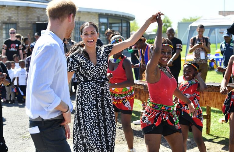 Meghan and Harry were seen laughing and dancing with locals on their first stop of 10-day tour.