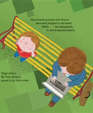 The book that Corrinne writes features a father and a son visiting a playground, but Tom, the son, does not feel brave enough in order to play with the other children at the park.