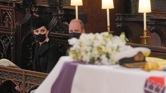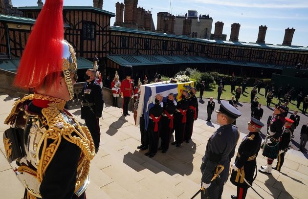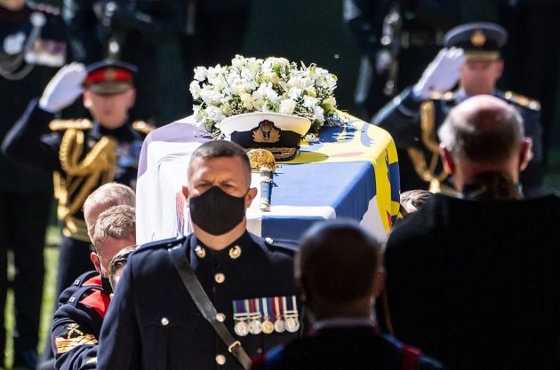 Prince Philip’s casket carried his naval cap, sword, and a wreath of flowers as pallbearers put him on to his self-designed green Land Rover Defender hearse.