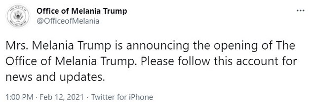 She made the announcement on her new Twitter account ‘The Office of Melania Trump,’ writing: “Mrs. Melania Trump is announcing the opening of The Office of Melania Trump. Please follow this account for news and updates.”