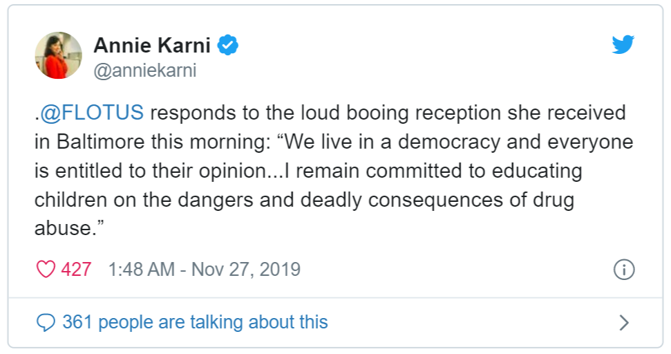 When asked about the booing she received, the first lady reportedly said: “We live in a democracy and everyone is entitled to their opinion, I remain committed to educating children on the dangers and deadly consequences of drug abuse.”