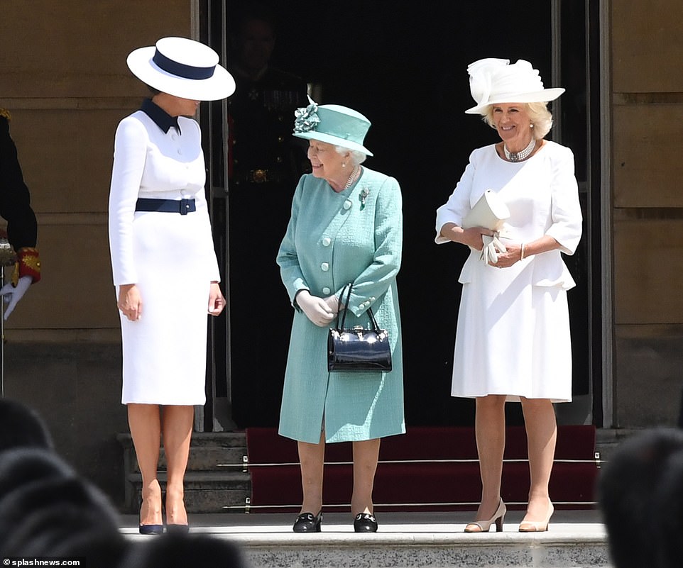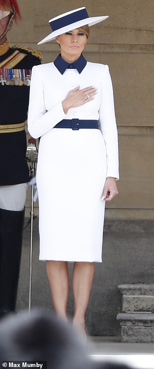 The 49-year-old arrived at Buckingham Palace with President Donald Trump wearing a white and navy outfit which was Princess Diana’s favourite colour combination.
