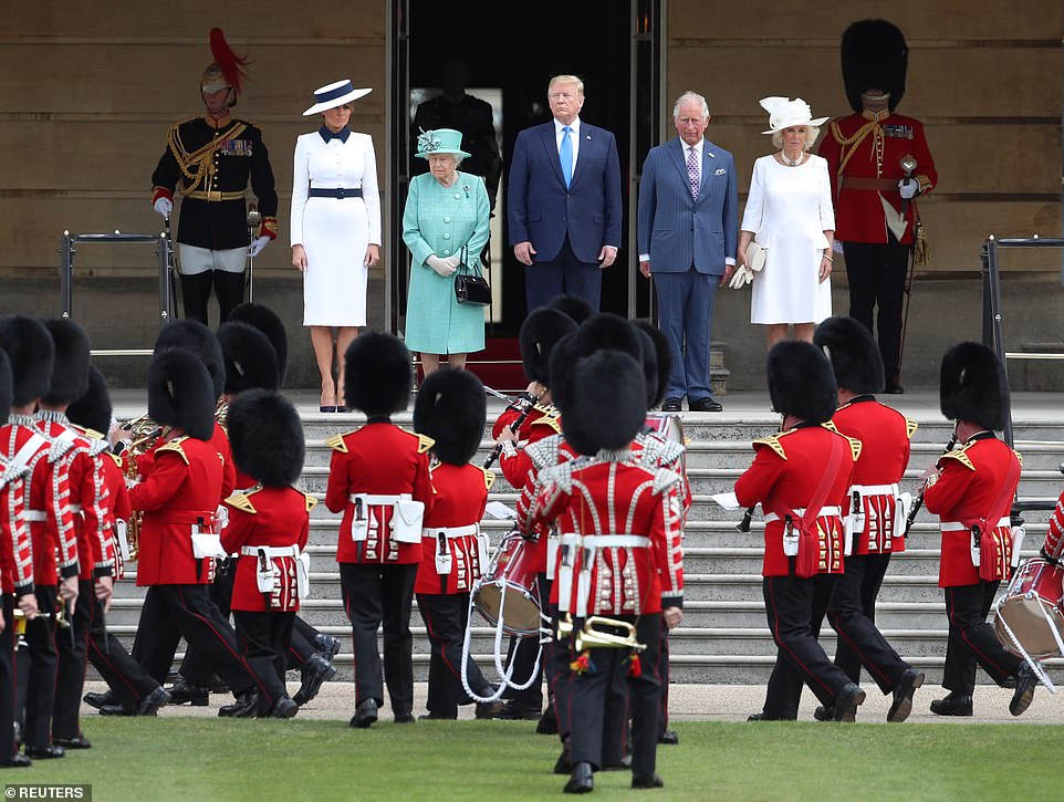 The Queen, Prince Charles and the Duchess of Cornwall welcomed President Donald Trump and Mrs. Trump at Buckingham Palace as they joined them for a private lunch at the palace.