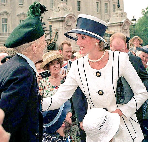 Her white and navy custom-designed Hervé Pierre hat was also a tribute to Princess Diana as she wore a similar hat for a V-J Day event in 1995.