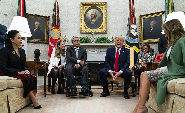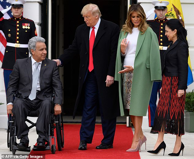 President Trump donned his traditional navy suit and bold red tie. Meanwhile, President Moreno opted for a dark grey suit and a pale grey tie for his trip to the White House. His wife wore a skirt of a blue and black chevron design which she teamed up with a black blazer.