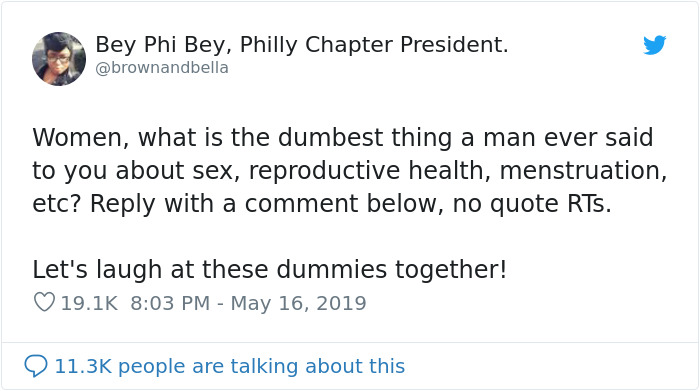 But they have an idea about how their bodies work. Read this to understand and that and you won’t infuriate your girlfriend by telling her to “keep it in” when she asks you to buy her some tampons. Recently, a Twitter user @brownandbella asked women to share their ridiculous moments and things they got from men about “sex, reproductive health, menstruation, etc” and BOY did they deliver!