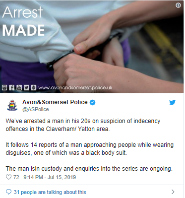 The man is supposed to be in his 20s and was held under the suspicion of indecency and obscenity. Talking about the location of the arrest, the Gimp suited man was chasing people in Claverham, Somerset.