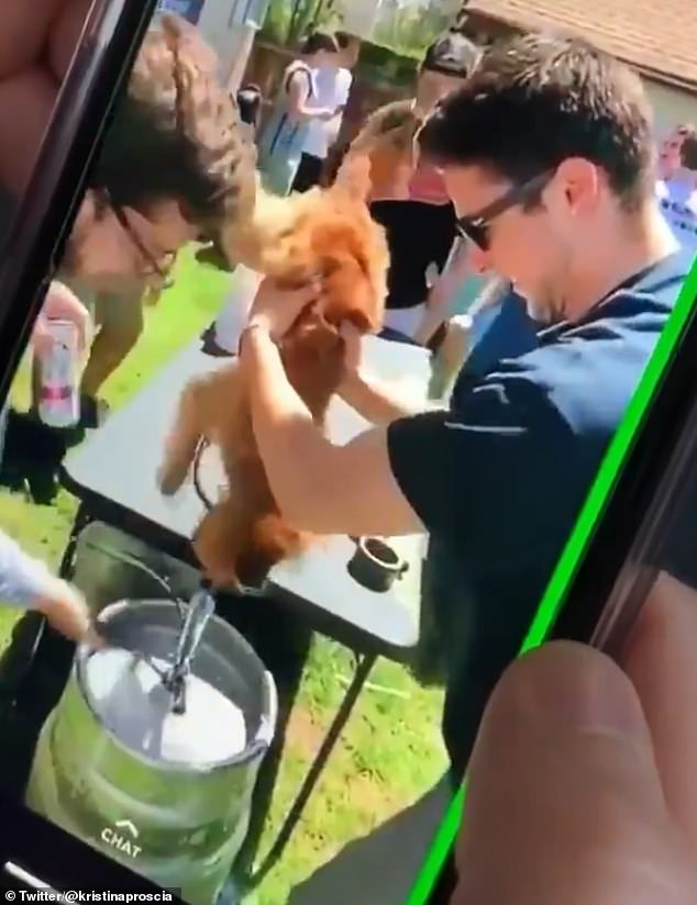The dog’s owner 21-year-old Hofstra senior Justin Barreto along with a man forced the little puppy to drink beer from a keg while the pup can be seen struggling to escape.