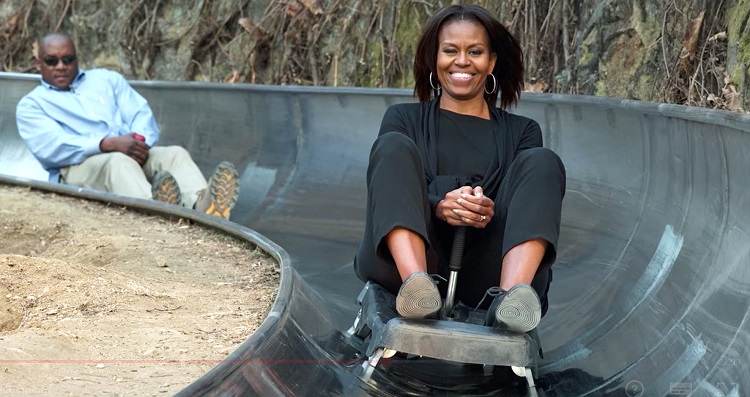 “And when Mrs. Obama saw the slide, she became interested in wanting to do it as well,” he continues, then he holds up a framed photo that showed the two of them going down the slide. Obama looks like she’s having the time of her life while Taylor, not so much.