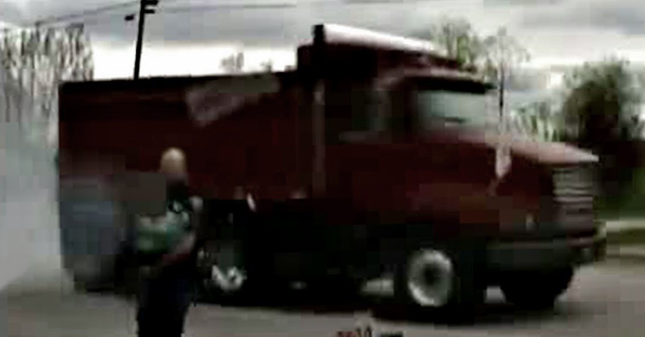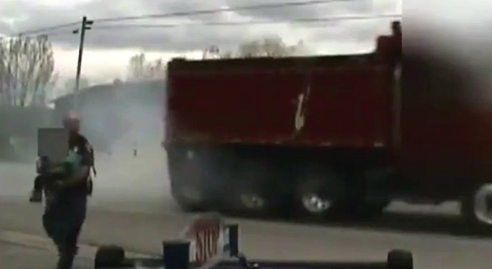 When the police officer saw the truck coming, he immediately swept off the child out of the street and brought him back to the safe side. After a while, the truck moves fastly exactly from the place where the child was standing.