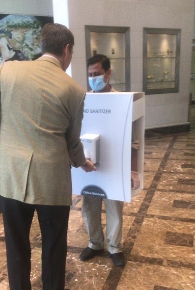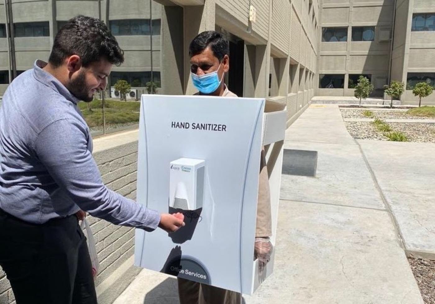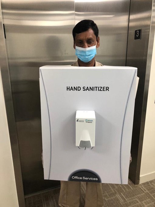 The incident occurred at the headquarters of Saudi Aramco, a Saudi Arabian oil mogul, where a worker wearing a box with ‘hand sanitizer’ written on it was pictured walking around with an actual dispenser to disinfect people’s hands.