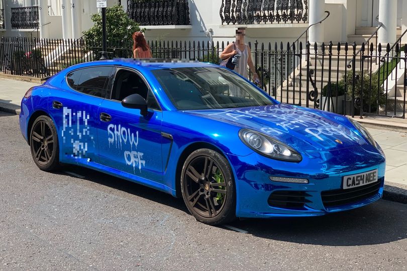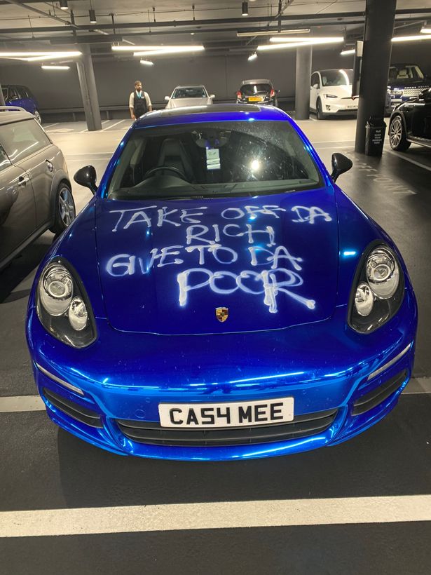 A millionaire has returned to his brand-new Porsche Panamera only to discover that it was spray-painted on the hoodie and over the side doors.