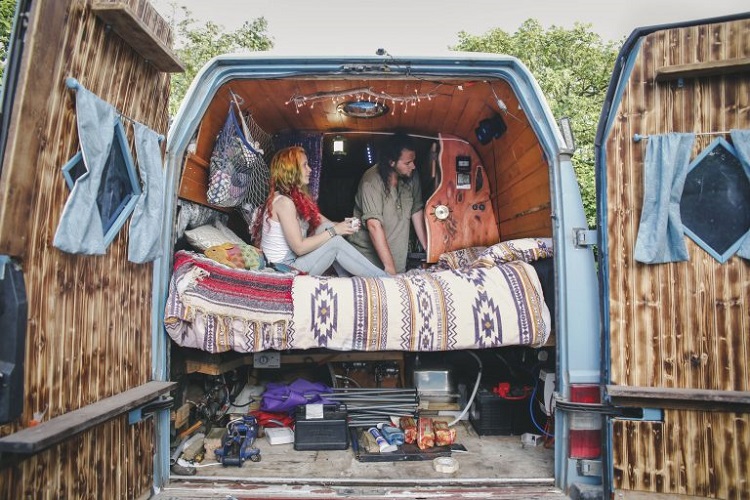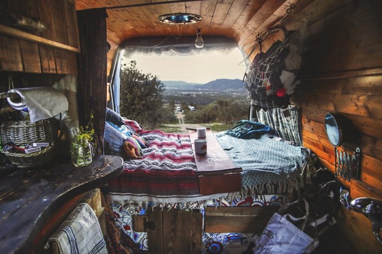 The decorations on their van are a visual journal of the places they’ve been. This includes Indian sheets, a handwoven rug they got in Greece, Thai elephant-patterned curtains, and a Mexican blanket.