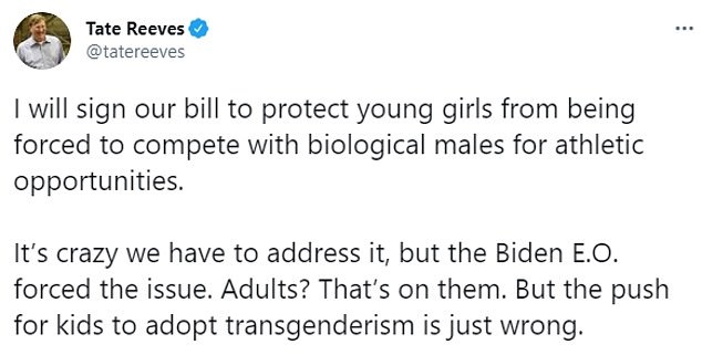 Speaking of the bill that passed the state’s House in an 81-28 vote, Governor Tate Reeves said young girls should not be forced to compete with biological males as he vowed to sign the bill.