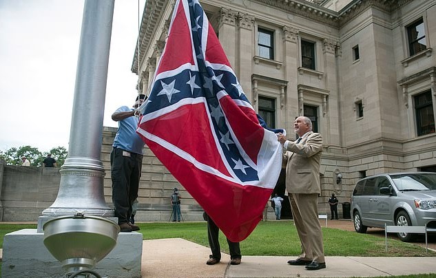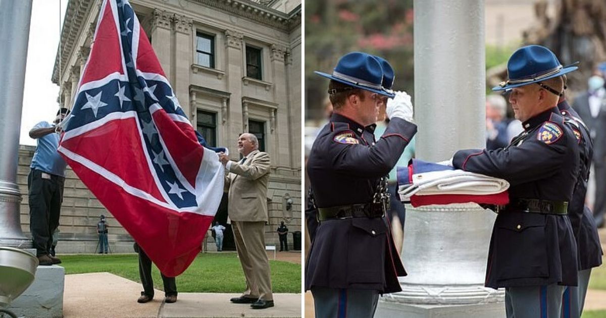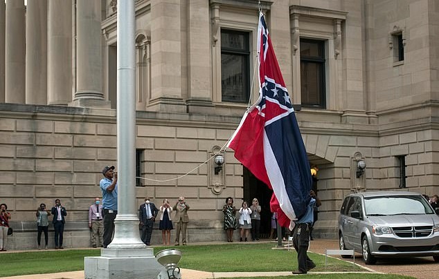 Three Mississippi state flags have been removed from the flagpoles outside the State Capitol after the government’s decision to strip the flag of its official status because it contains a Confederate emblem.