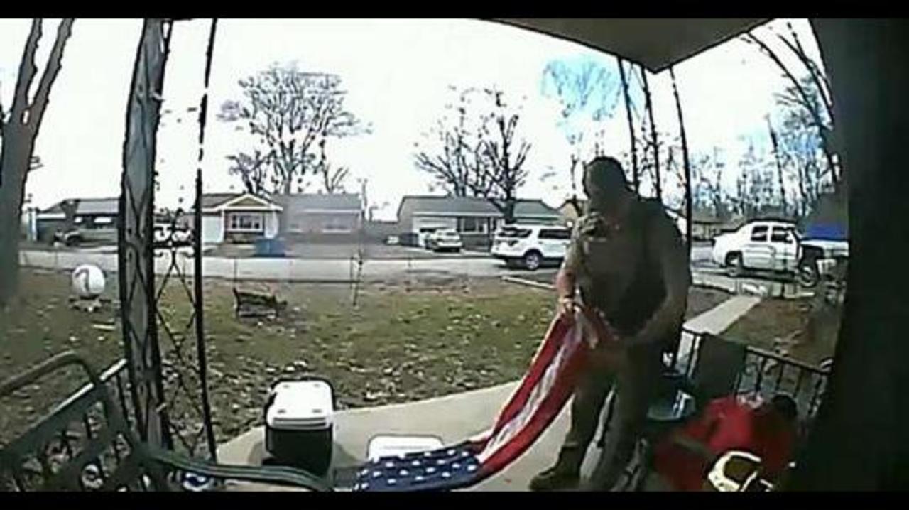 In the video, McElroy is seen driving by the home before turning his patrol vehicle around and stopping nearby. The video shows the American flag draped along with the lawn, with the bent pole parallel to the ground.
