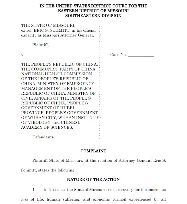As the increasing pressure on China over its handling of the pandemic is becoming more and more evident, Missouri has blamed the Chinese government for the devastating outcome in a lawsuit filed in the U.S. District Court for Eastern Missouri.