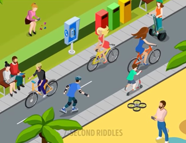 In the picture, you can see people exercising and enjoying the outdoors on a sunny day. While many of them are riding bikes and scooters, one man can be seen flying a drone.
