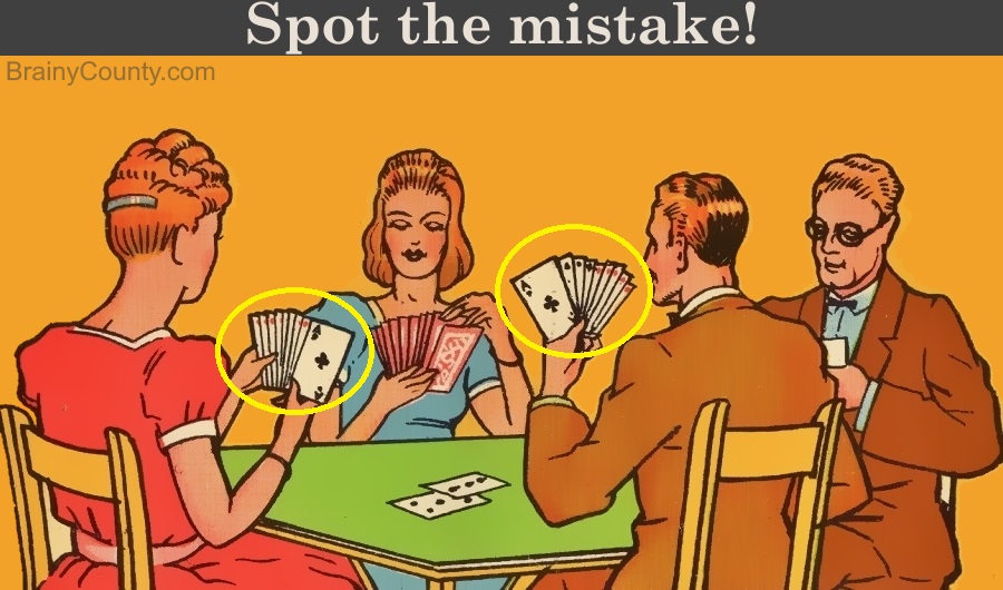 If you’re still struggling, we’re here to help you out a bit. There is nothing wrong with the people in the picture puzzle. However, there is something wrong with the cards they are holding.