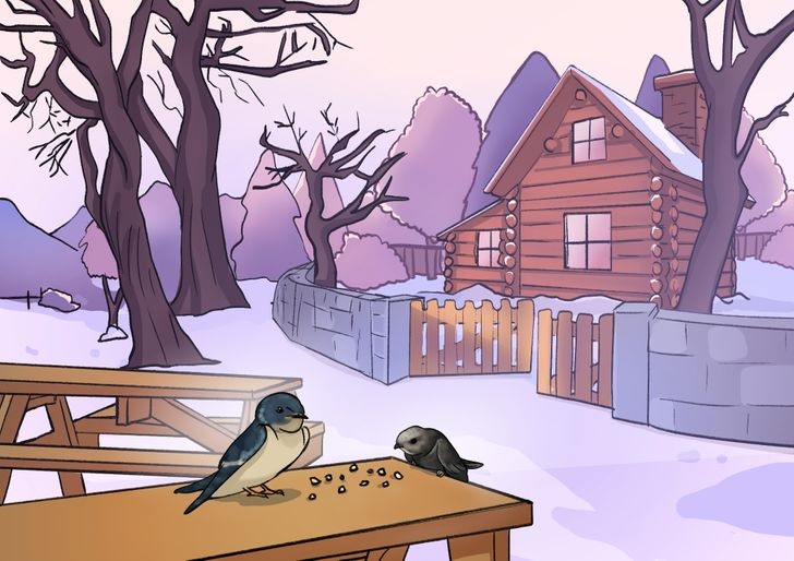 In the picture, you can see a house made of wood and surrounded by a concrete fence. In the front, you can also see two birds, a swift and a swallow, eating the bread crumbs the kind homeowner had left for them on the table.