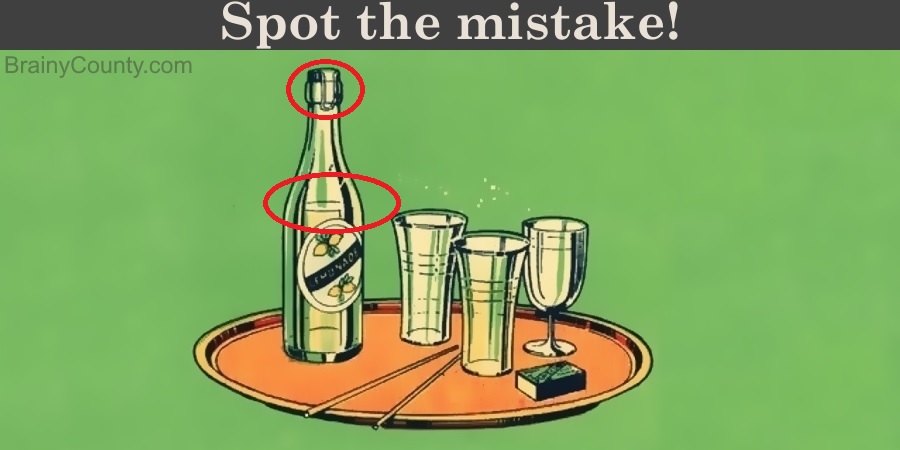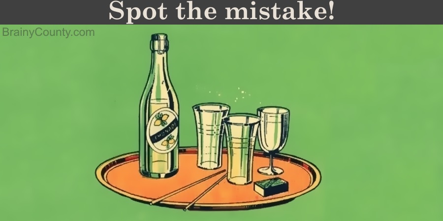 As you can see, the image features a tray with three glasses and a glass bottle on it. One can also notice a matchbox and two wooden sticks. But where’s the mistake?