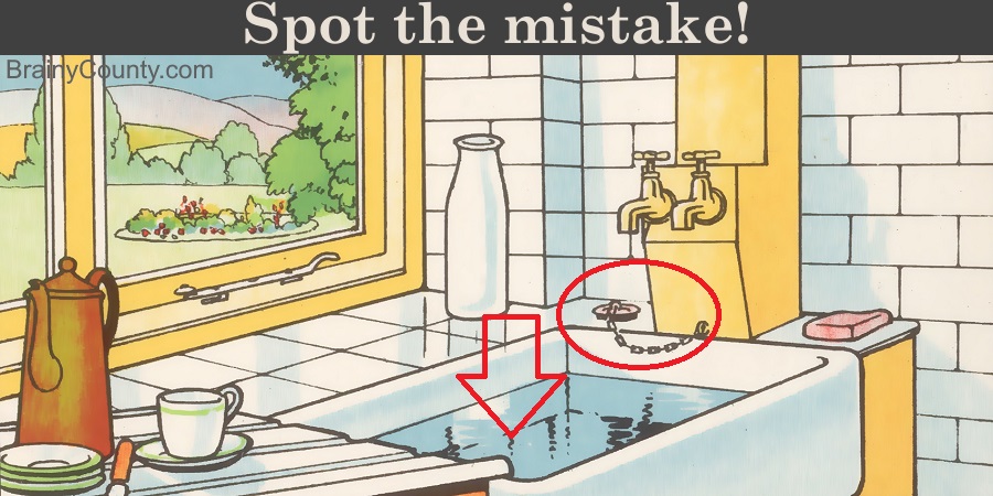 This time, the mistake concerns the sink. As you can see, it is filled with water even though the plug is not in use. The drain must be clogged!