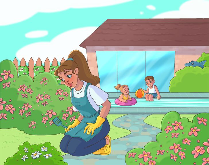 Her children are playing in the pool just behind her. There are many flowers in the garden and the area looks clean.