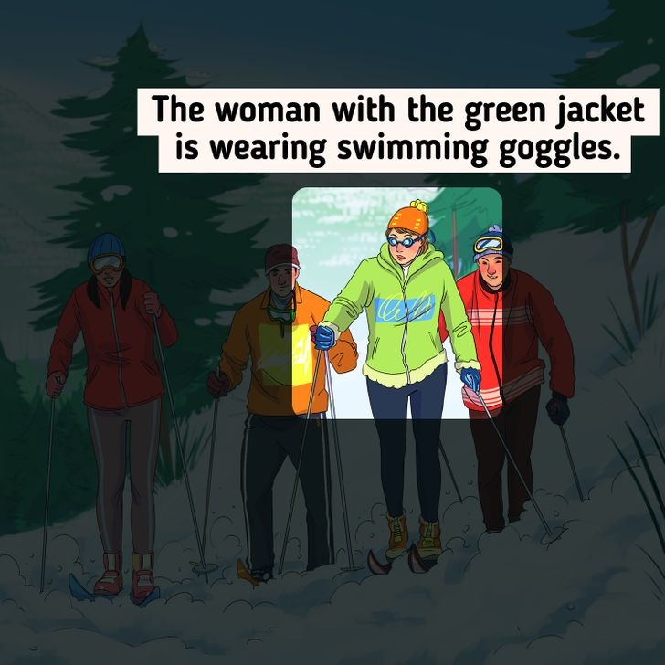 As you can see, the girl in the green jacket is wearing swimming goggles when she should be wearing ski goggles. Did you spot the tiny detail?