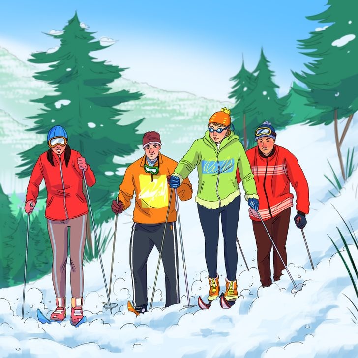 The graphic shows four friends skiing in the mountains. They are definitely enjoying their trip to nature and appear to be ready for more action.