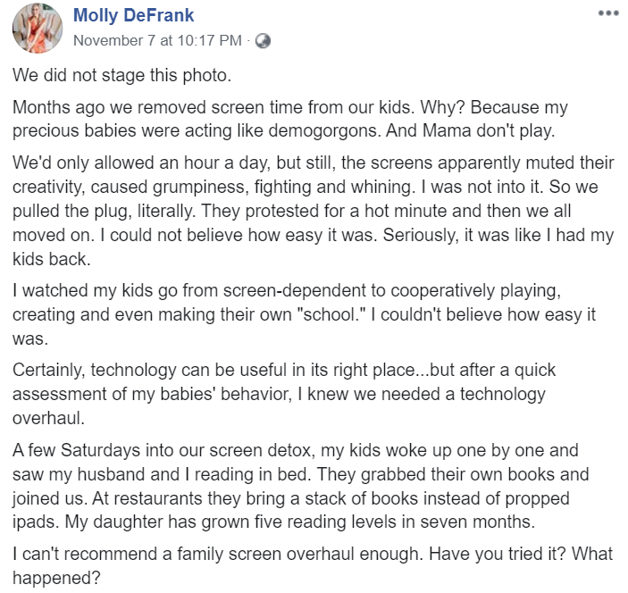 Molly DeFrank always knew that the time little kids spend on screens – be they phone, computer, or TV – is harmful to them. So DeFrank, who’s a blogger and a writer, forbade her kids from using screens.