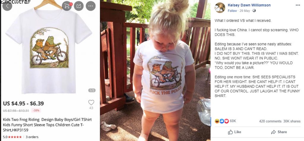 Kelsey shared the picture of her daughter wearing that T-shirt on Facebook with the caption, ‘’What I ordered VS what I received.