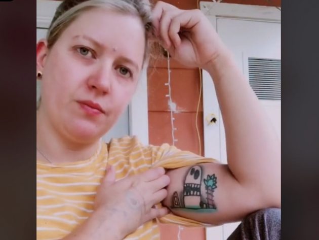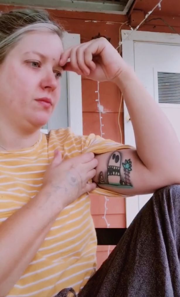 In her video, the mother lifts up her sleeve and revealed an adorable tattoo on her arm. It was a ‘pirate cove’ with a huge rock beside a palm tree.